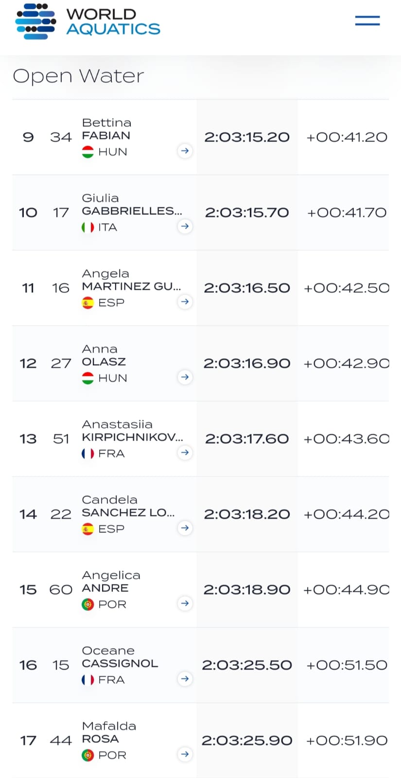 Candela consiguió meterse en el segundo grupo de carrera entre golpes en la salida y complicados pasos de boyas, y mantener su posición hasta el final de prueba, donde logró cambiar el ritmo y adelantar puestos hasta tocar la placa de llegadas en la 14ª posición, tan solo a 44 segundos de la nadadora que se proclamaba campeona del mundo absoluta.