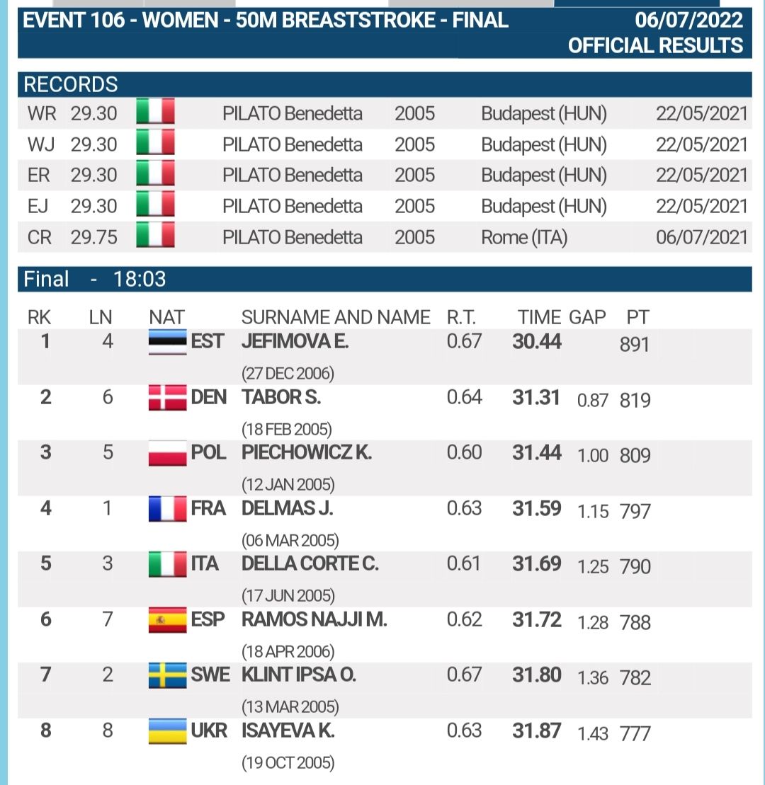 Nuestra joven nadadora María Ramos Najji ha terminado su participación en el Campeonato de Europa Junior logrando un grandísimo 6° puesto en la prueba 50 Braza y 13° puesto en la prueba 100 Braza.