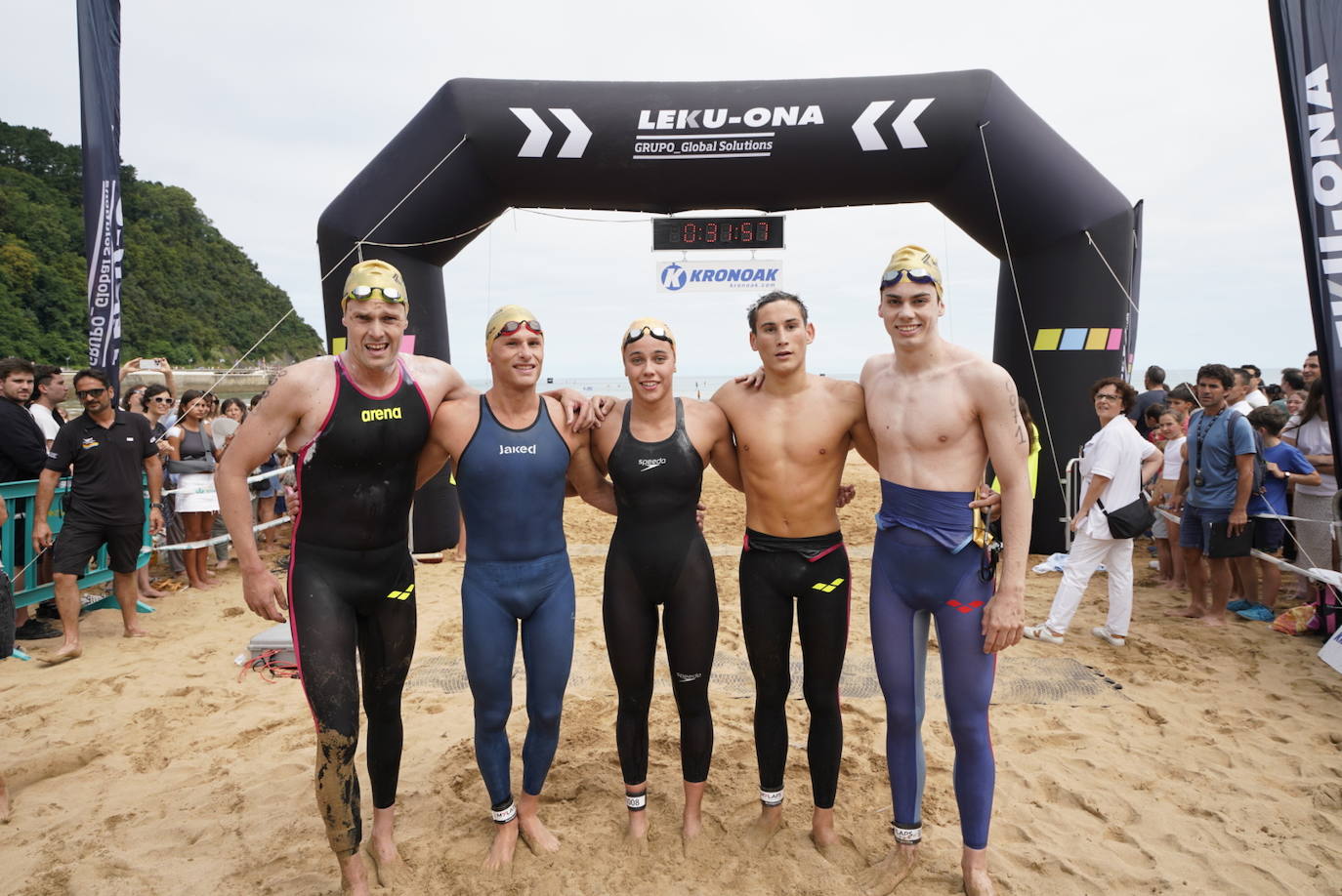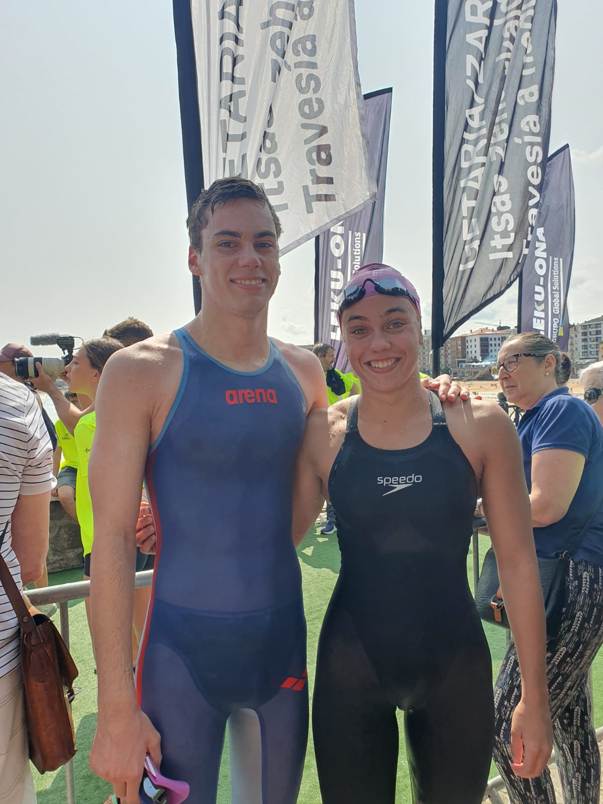 Nuestro nadador especialista en pruebas de fondo RUBÉN VAN GOOL FERNÁNDEZ y nuestra internacional en aguas abiertas CANDELA SÁNCHEZ LORA, recién llegada del Campeonato del Mundo de Fukuoka, participaron el sábado 22 en la Travesía de Zarautz – Mollarri – Zarautz (5000m.) y el domingo 23 en la Travesía de Getaria – Zarautz (2850m.), y, en ambas, tanto Rubén como Candela se proclamaron CAMPEONES, y además lograron batir los RÉCORDS Masculino y Femenino de la travesía de Getaria – Zarautz.